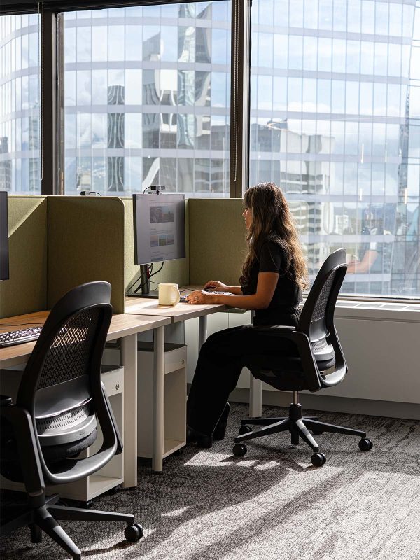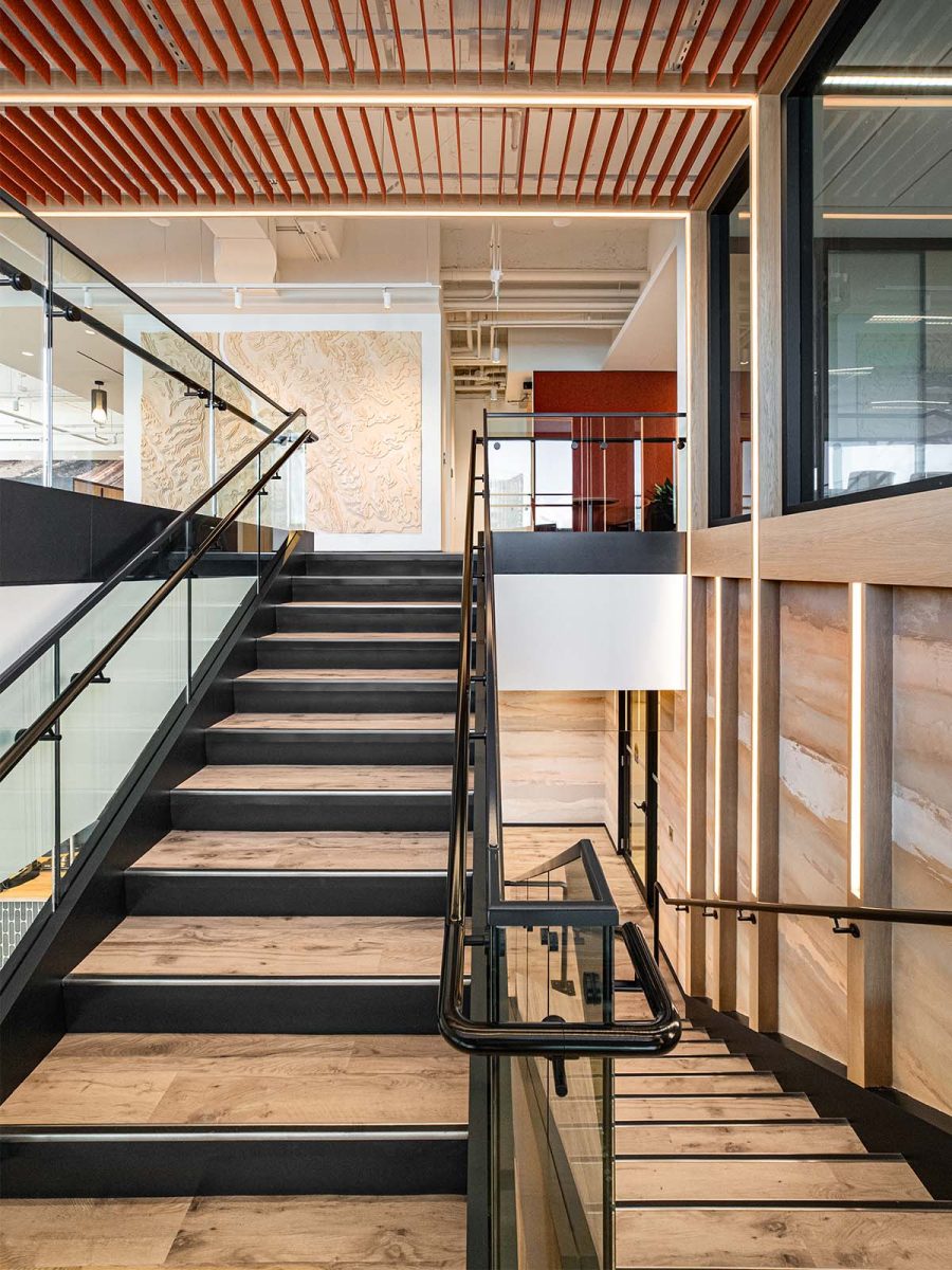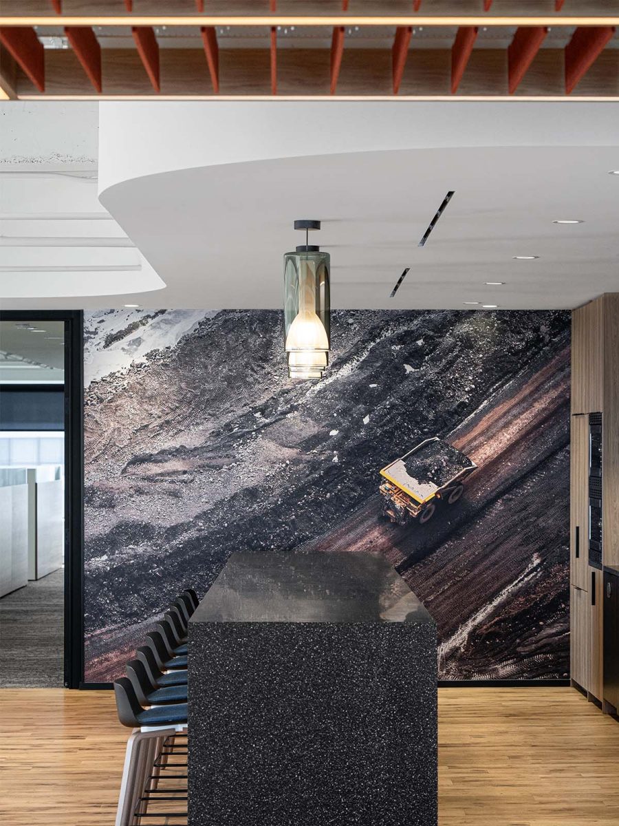 The reception area showcases the process from coal to coke through a bespoke rock installation. Meeting rooms take their names and colours from the company’s mine sites in Southeastern British Columbia, grounding employees in the operations that are at the core of their business. In the pantry, a large topographic artwork, crafted from real site data, translates land into art. Beneath the staircase, a full-scale set of railway tracks, gifted by a partner, symbolises the coal-to-steel process that connects EVR’s work to global progress.