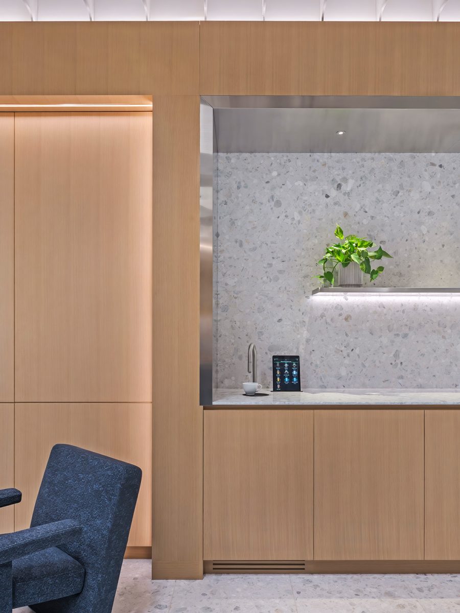 The additional floor accommodates more than 130 workstations, as well as front-of-house and client-facing spaces. While aligned with the firm’s existing Dubai workplace, the project introduces new spatial typologies. These include dedicated visitor offices for colleagues travelling from other international hubs, responding to increased cross-regional movement. Flexible meeting and social spaces support collaboration, internal events and client engagement.