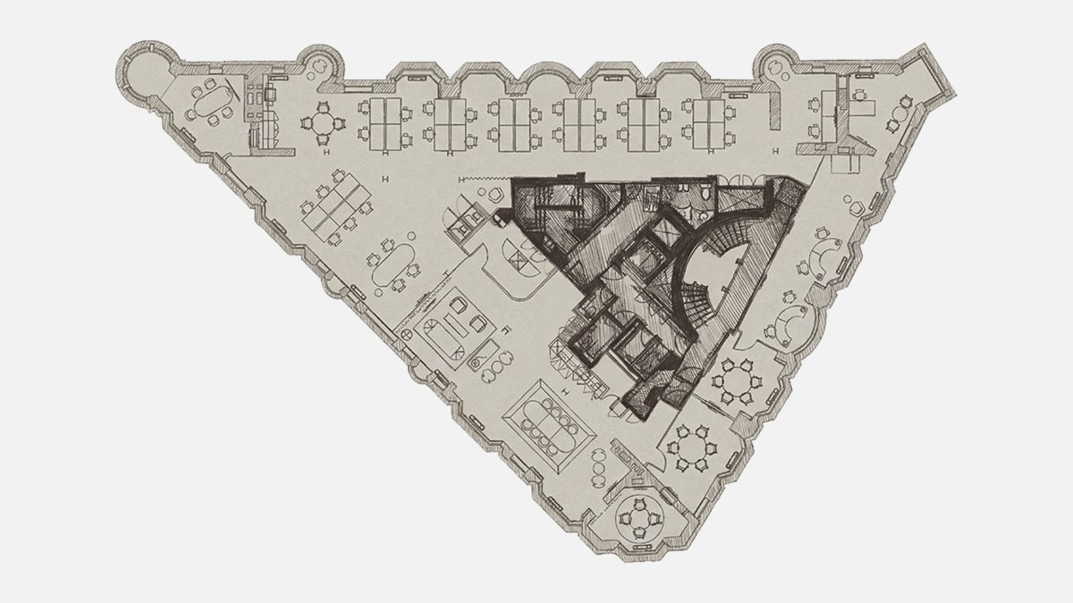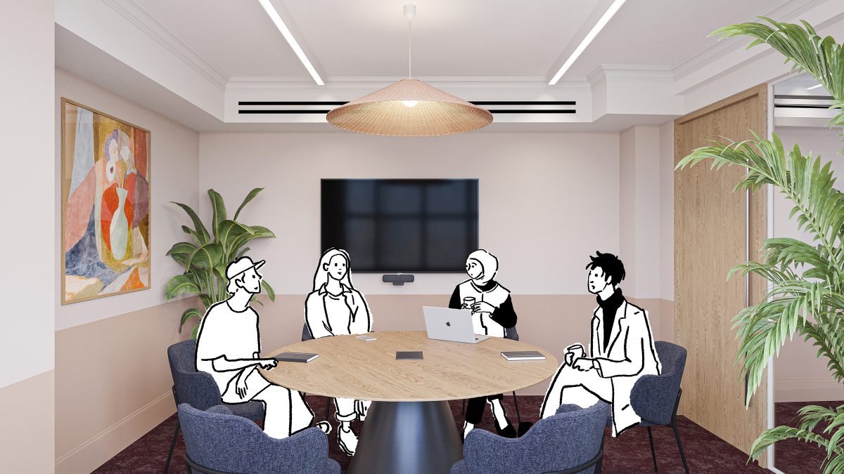 We treated the triangular floorplate and narrow elevation as opportunities to organise the space. Retained structural elements are used to form meeting rooms, enclosed spaces and informal seating, creating layered privacy and spatial variety without incurring additional structural cost.